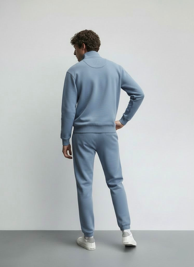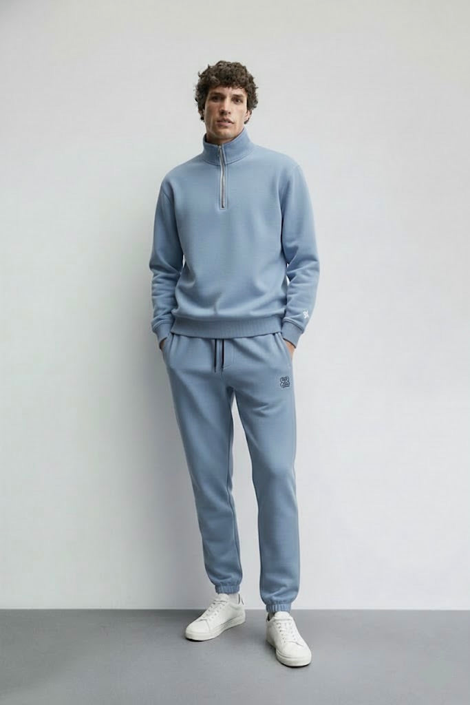 The sweatshirt features an elegant embroidered neck yoke, adding a refined premium touch, while the quarter zipper with original YKK brass zip ensures smooth functionality and a standout look. Finished with subtle brand embroidery on the trouser, this co-ord set blends minimal design with elevated detailing.